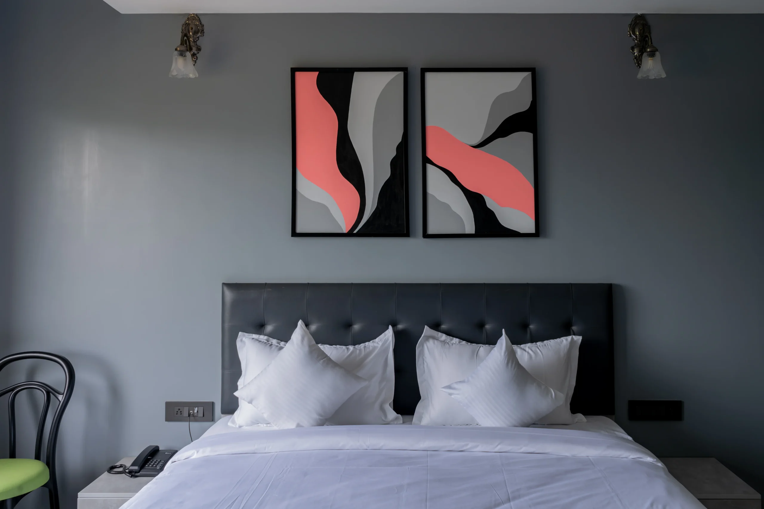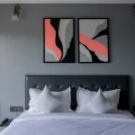 Framed in sleek black frames (as shown), this diptych forms a stunning symmetrical statement above beds, sofas, or entryways — as seen in this chic dark grey bedroom, where the coral red provides a warm, inviting pop against the cool backdrop.