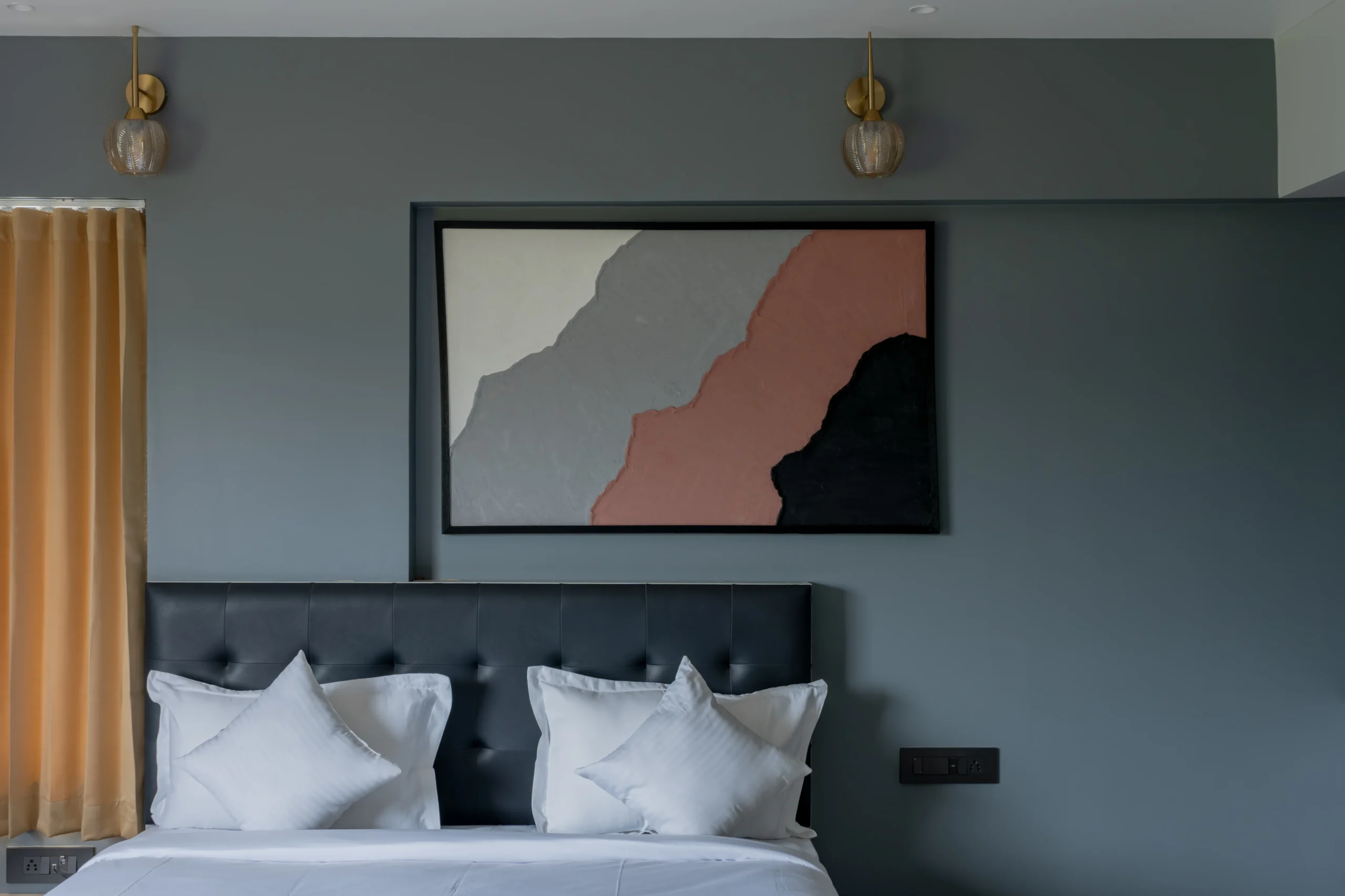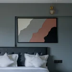 Hand-painted on high-quality stretched canvas or panel, this single large-scale piece makes a confident, luxurious statement above beds, sofas, or accent walls — as beautifully displayed in this modern dark grey bedroom, where the terracotta sweep adds grounding warmth and sophisticated drama against the cool neutral tones.