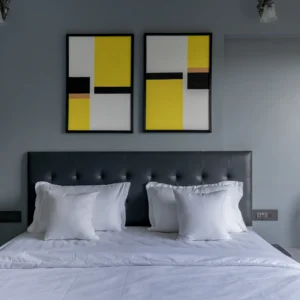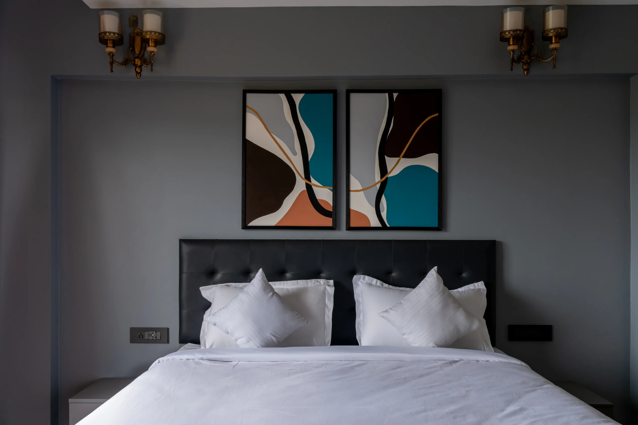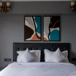 Framed in sleek black frames (as shown), this diptych is perfectly suited for symmetry above beds or sofas — as seen in this elegant dark grey bedroom, where the warm tones provide soothing contrast and a luxurious, grounded feel.
