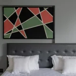 Hand-painted on high-quality stretched canvas or panel, this large-scale single piece makes a confident, modern statement above beds, sofas, or accent walls — as perfectly showcased in this sleek dark grey bedroom, where the vibrant coral red adds warmth and focus against the cool neutral tones, transforming the space with luxurious drama.
