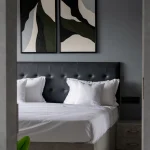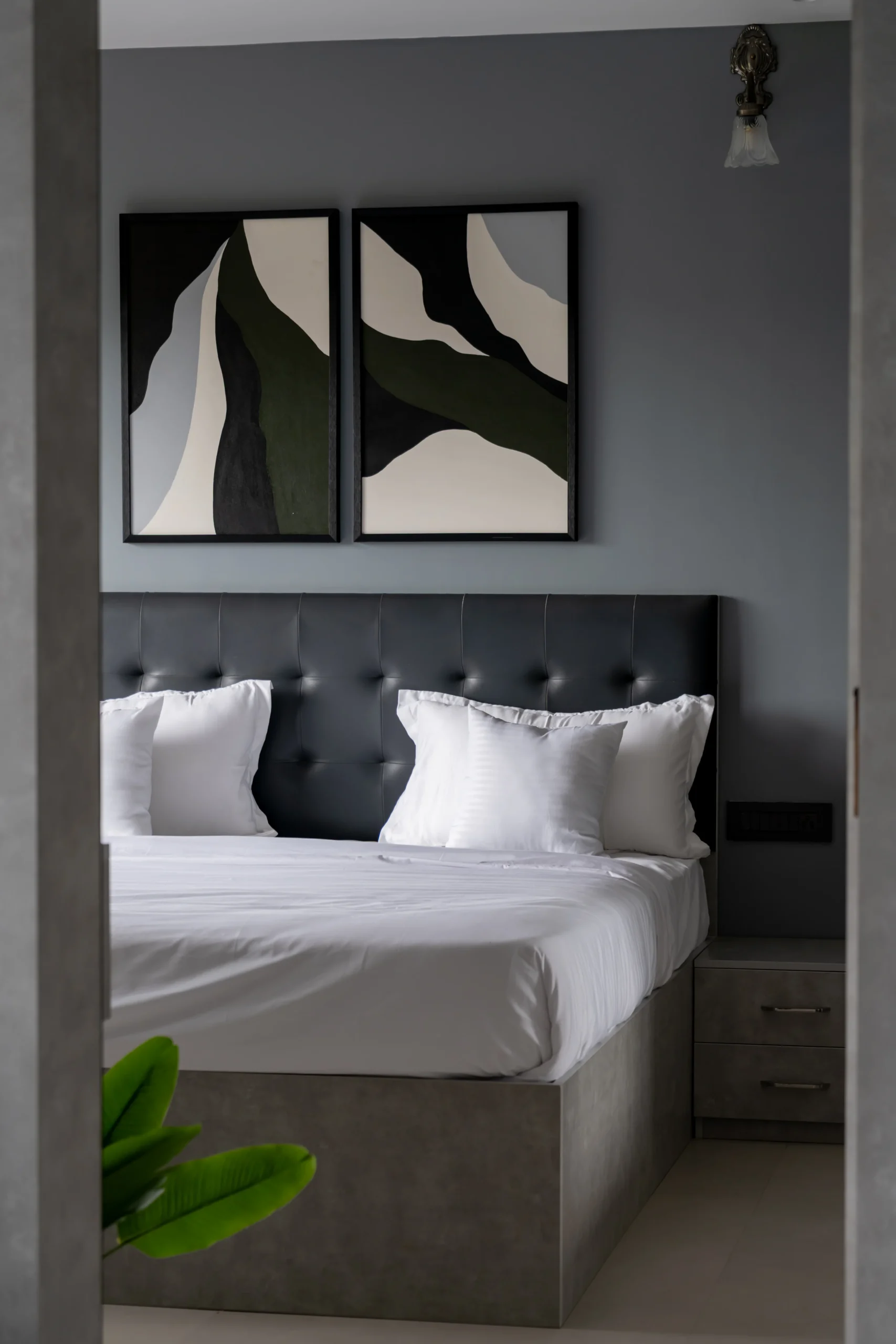 Framed in sleek black frames (as shown), this diptych is perfectly suited for symmetry above beds or focal walls — as seen in this elegant dark grey bedroom, where the muted greens and beiges provide soothing contrast and a luxurious, spa-like serenity.