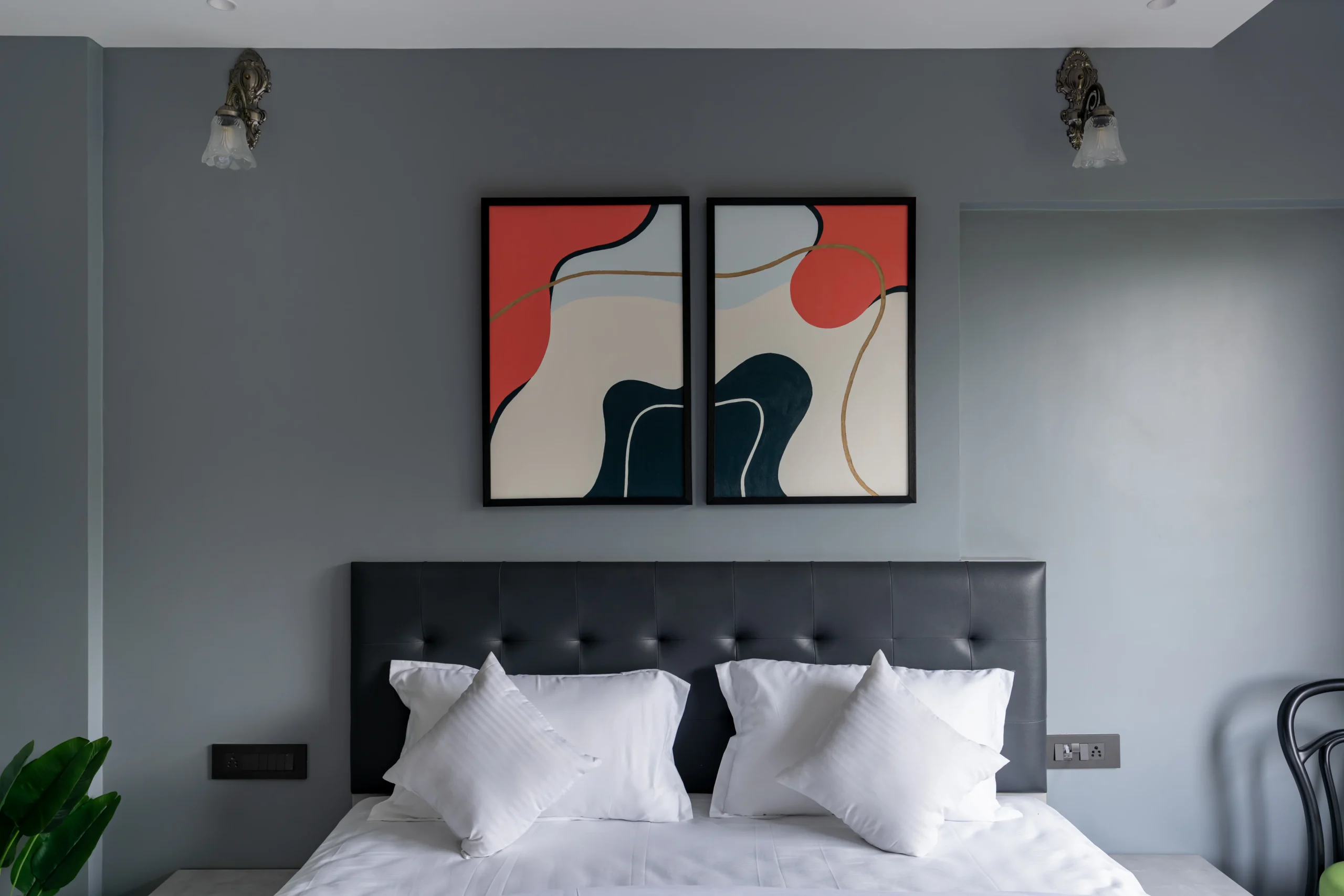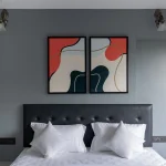 Framed in sleek black frames (as shown), this diptych is perfectly proportioned for symmetry above beds or focal walls — as beautifully displayed in this serene dark grey bedroom, where the warm terracotta and navy tones provide balanced contrast and a luxurious, spa-like tranquility.