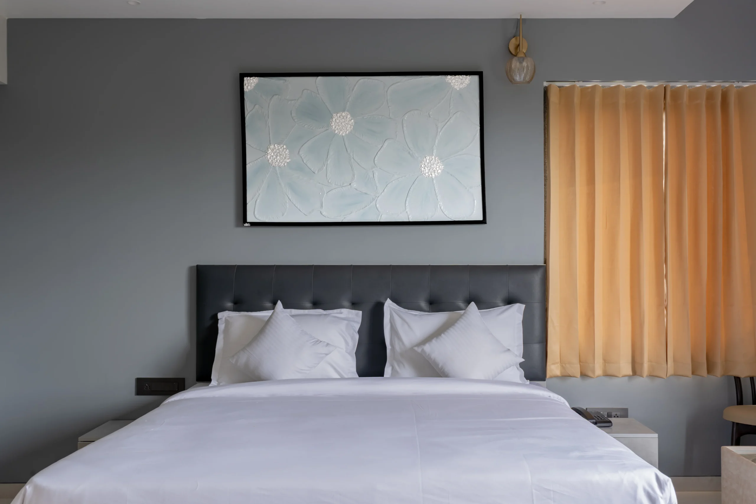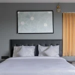 Hand-painted on high-quality stretched canvas or panel, this large-scale piece makes a peaceful yet captivating focal point above beds, sofas, or accent walls — as perfectly displayed in this contemporary dark grey bedroom, where the soft blue tones add tranquility and a luxurious, spa-like touch against the cool neutral palette.