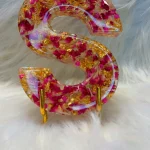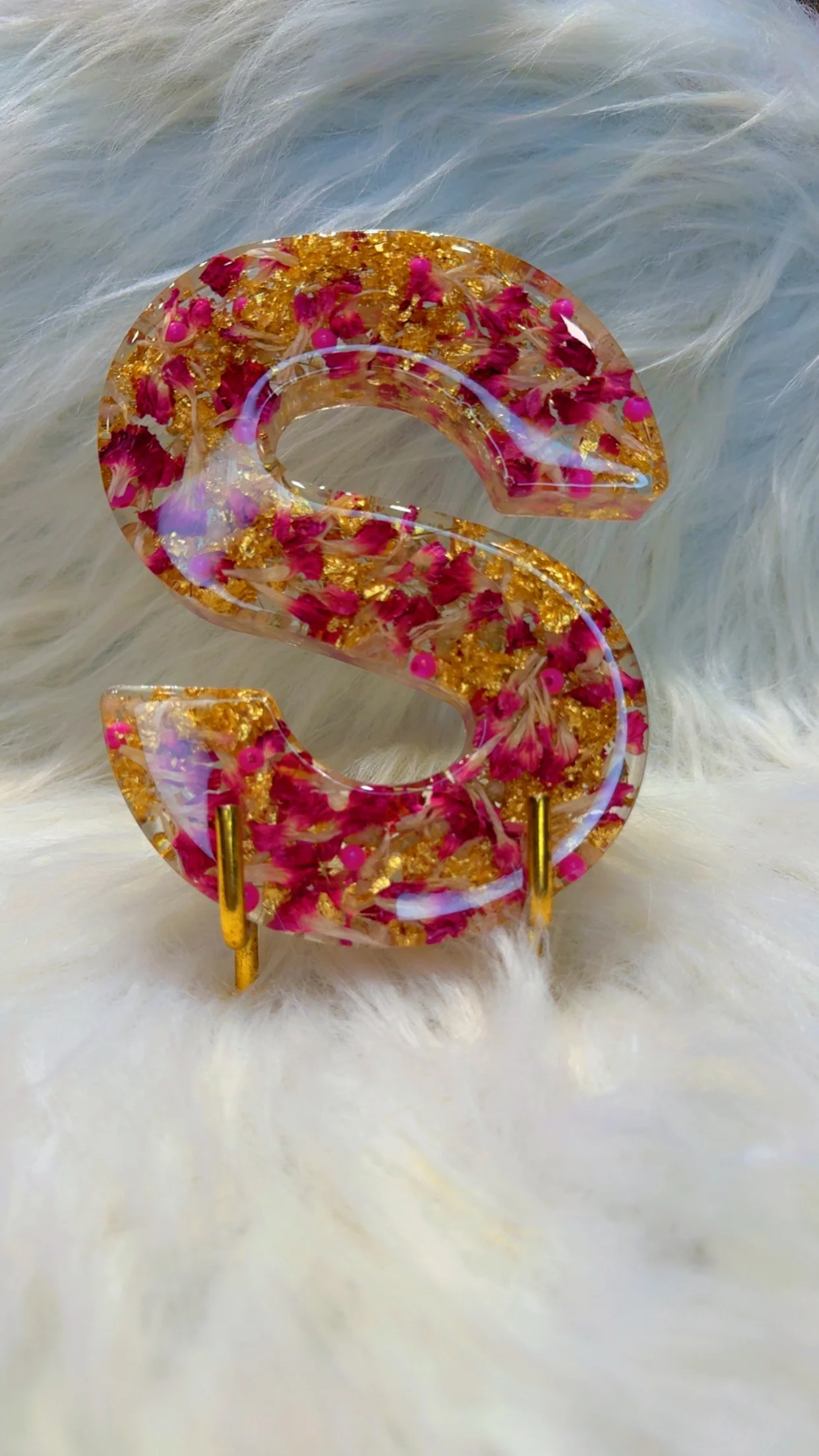 The elegant, freestanding letter “S” is meticulously poured with premium crystal-clear epoxy resin, perfectly preserving real pressed dried pink and red flower petals, tiny blossoms, and soft foliage in stunning 3D layers. Genuine gold leaf flakes shimmer throughout, adding a luxurious, warm glow that catches and reflects light beautifully from every angle. The translucent resin creates incredible depth and a soft, ethereal luminescence, making the flowers appear to float inside the letter like a romantic, preserved moment.