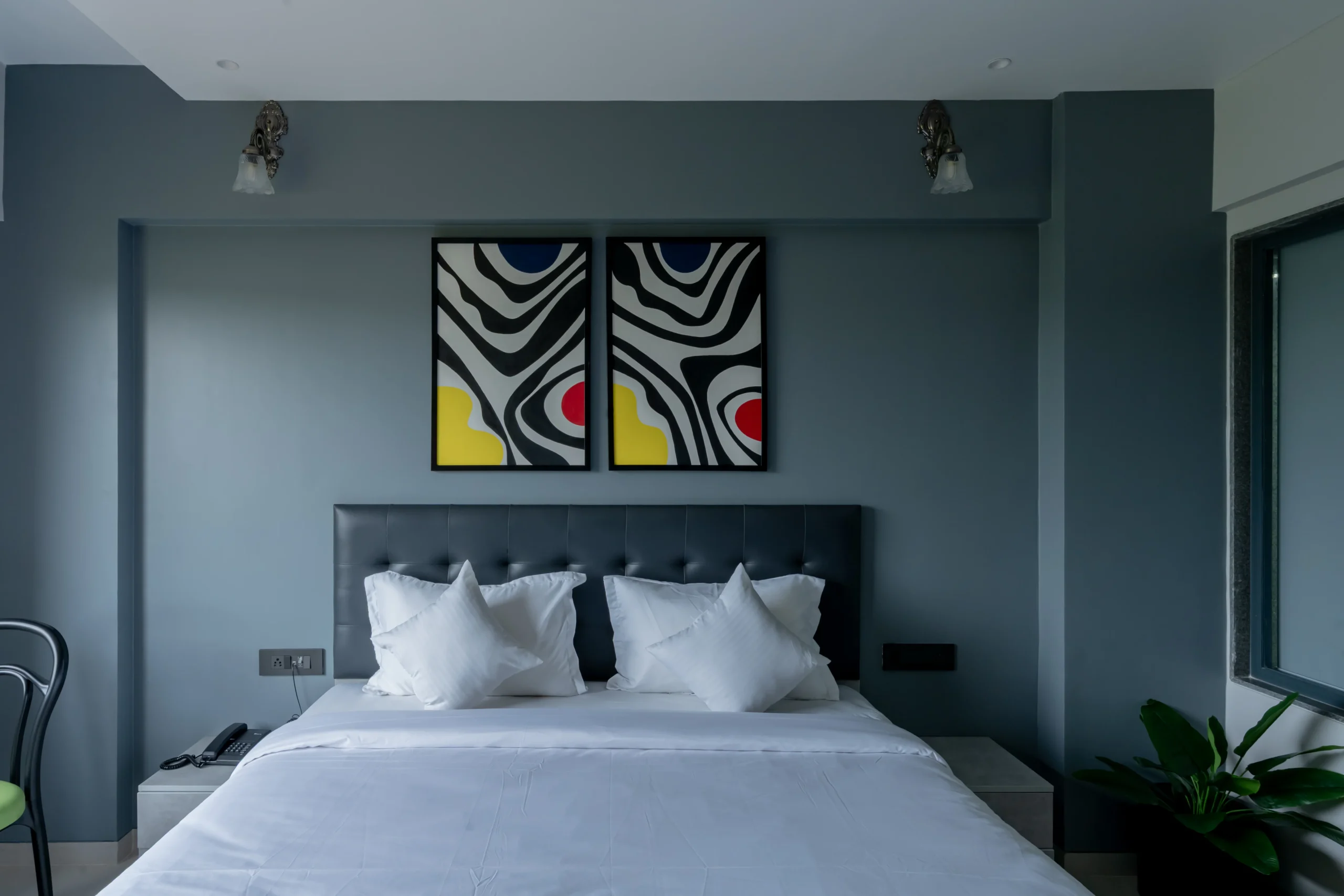 Framed in sleek black frames (as shown), this diptych is perfectly proportioned for symmetry above beds, sofas, or focal walls — as seen in this sleek dark grey bedroom, where the bold colors provide stunning contrast and inject life into the neutral palette.