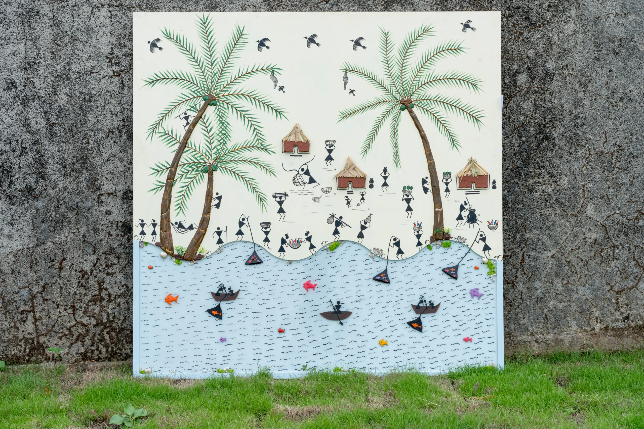 Towering palm trees with richly detailed green fronds and textured brown trunks frame the composition, creating a sense of lush paradise. Classic black Warli stick figures (geometric triangles and lines) bring the scene to life with joyful activities: villagers fish from small boats, carry baskets on their heads, cook over fires, relax in hammocks, harvest, gather around thatched-roof huts, and interact with nature. Below, a wavy light-blue river or sea sparkles with colourful fish (bright orange, pink, purple, and yellow accents) and subtle wave patterns, while birds glide overhead. Raised textured elements on the palms, foliage, and ground add genuine 3D depth, making the piece interactive with light and shadow.