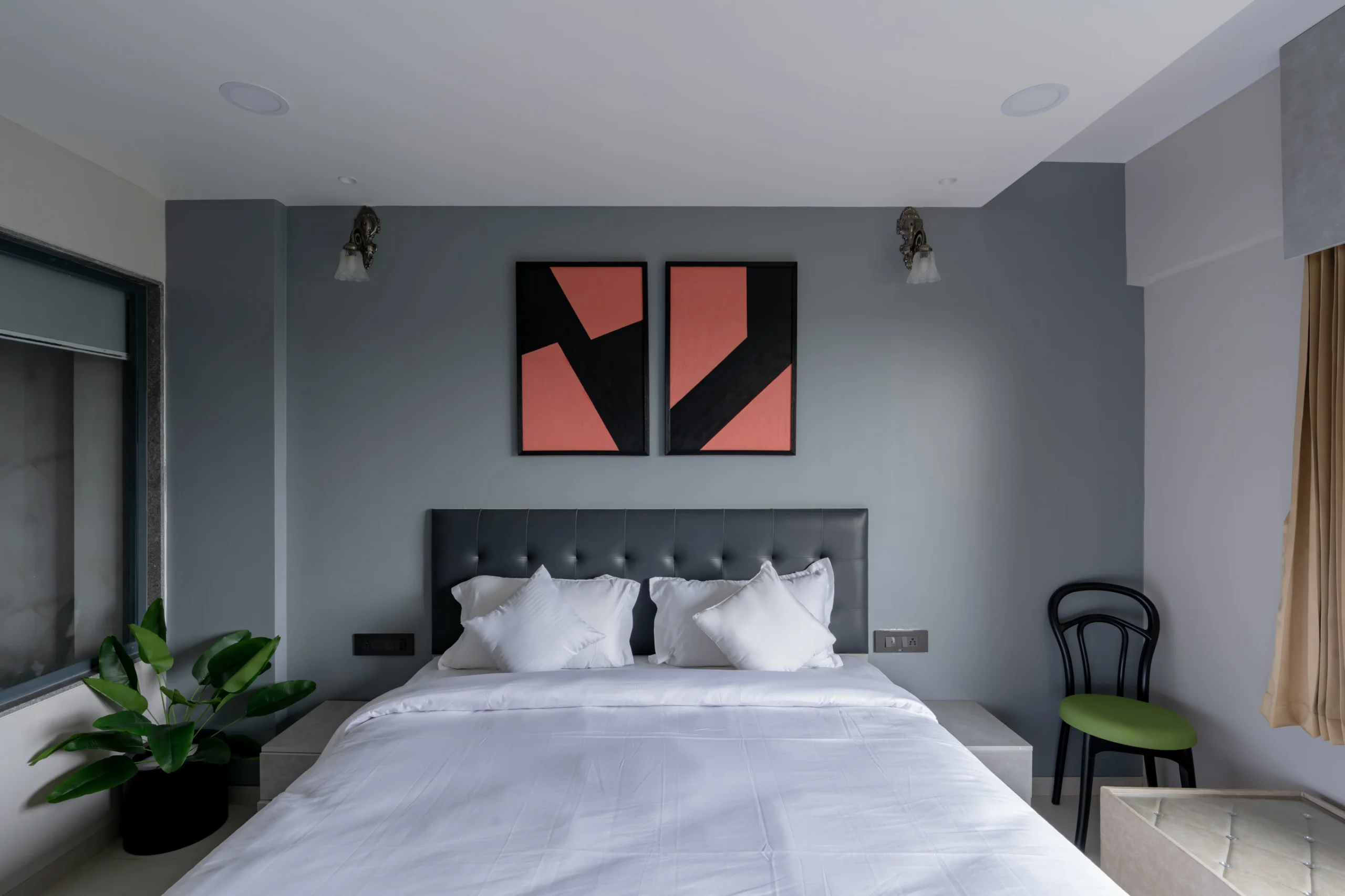 Framed in sleek black frames (as shown), this diptych forms a perfect symmetrical statement above beds or focal walls — as beautifully demonstrated in this modern dark grey bedroom, where the coral red provides a warm, confident pop against the cool, sophisticated backdrop.