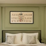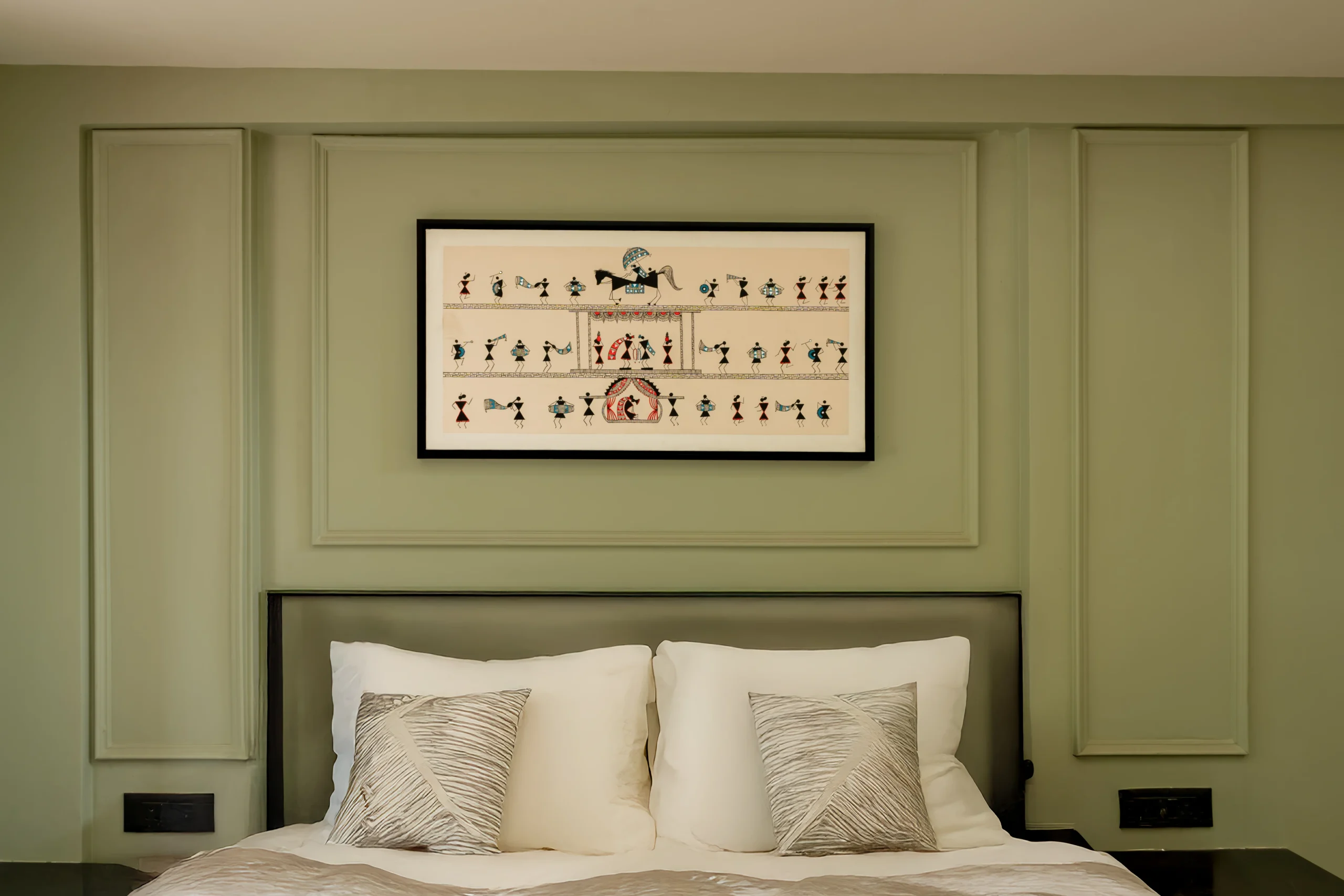 Painted with premium acrylics on high-quality stretched canvas, the colors are gentle yet vivid with a subtle matte finish that feels timeless. Framed in a sleek black frame (as shown), this wide format is ideal as a statement piece above beds, sofas, or dining areas — as perfectly showcased in this luxurious bedroom with olive-green walls and a plush headboard, where it adds cultural richness, joy, and a sense of grand narrative.